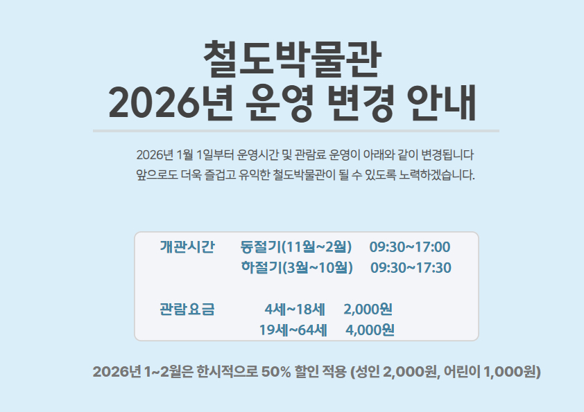 2026년 1월 1일부터 철도박물관의 운영시간과 관람료가 아래와 같이 변경됩니다.