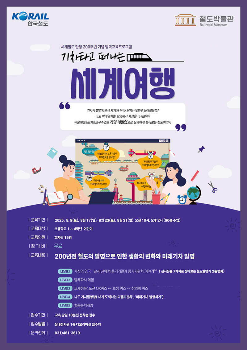 철도박물관은 여름방학을 맞아 세계철도 탄생 200주년 기념 방학교육 프로그램을 운영합니다. 많은 참여와 관심 부탁드립니다.